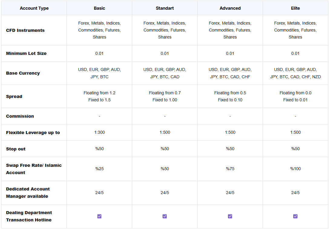 The Elite Account is built for experienced and high volume traders who prioritize premium trading conditions. It supports all available CFD instruments and offers the widest selection of base currencies including USD, EUR, GBP, AUD, JPY, BTC, CAD, CHF, and NZD. Spreads are the most competitive with floating spreads starting from 0.0 pips and fixed spreads from 0.01 pips. Leverage remains flexible up to 1:500 and the stop out level is set at 50 percent. Traders receive full swap free eligibility, a dedicated account manager available 24/5, and continuous access to the dealing department transaction hotline.